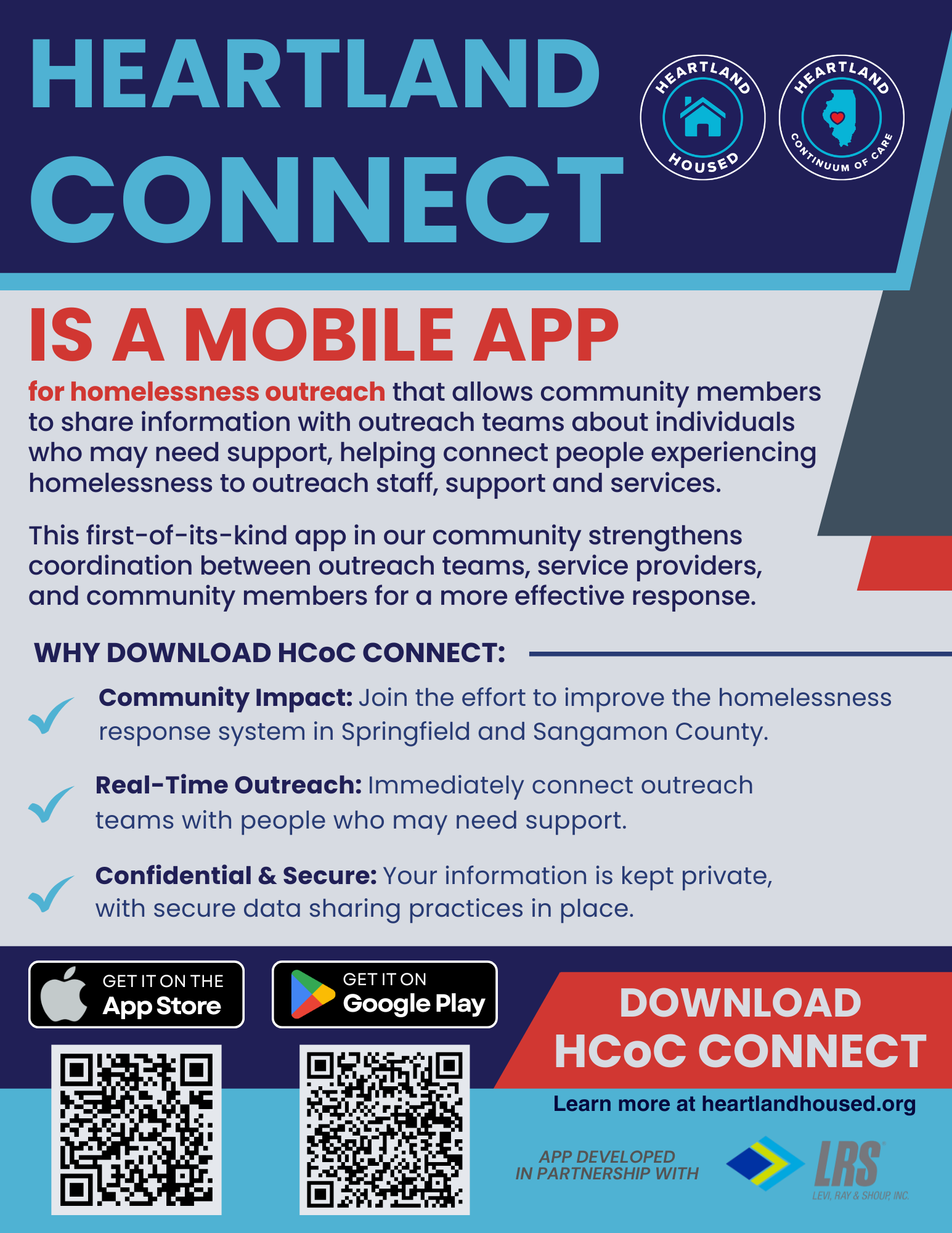 Heartland Connect is a first-of-its-kind mobile app designed to collect and track street outreach data for people experiencing homelessness and support efforts to address homelessness and housing insecurity in Springfield and Sangamon County. Whether you're someone needing support, a street outreach worker, or a concerned community member, the app simplifies the process of connecting people to services and resources.