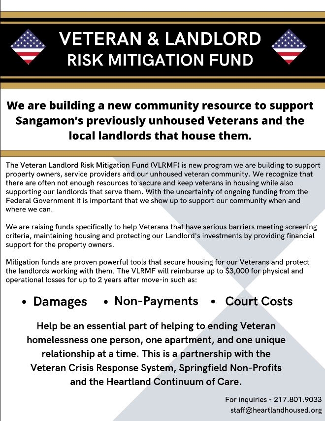 The Veteran & Landlord Risk Mitigation Fund (VLRMF) is a community resource designed to support Sangamon County’s previously unhoused Veterans and the landlords who house them. This fund provides financial protection to landlords and helps Veterans overcome barriers to housing by covering up to $3,000 in potential losses for up to two years after move-in.